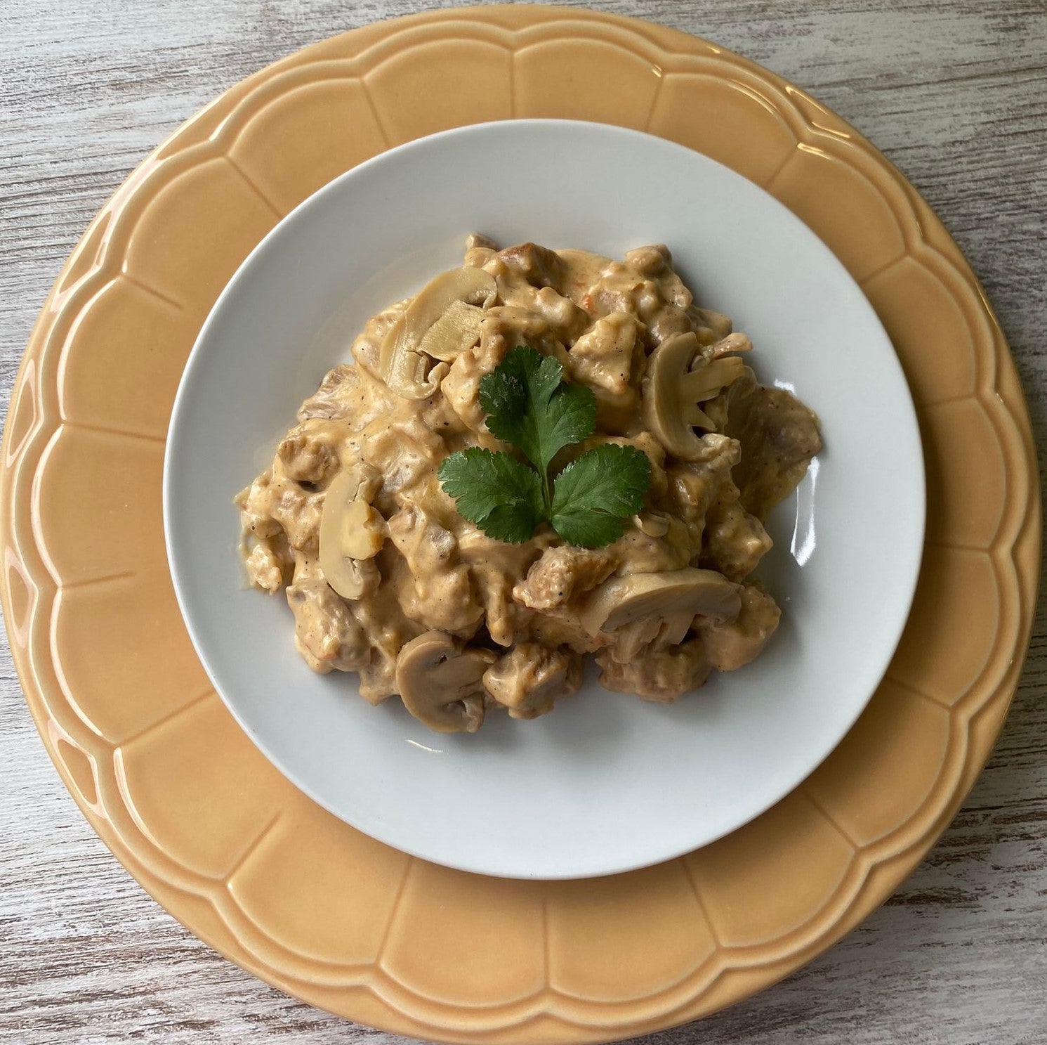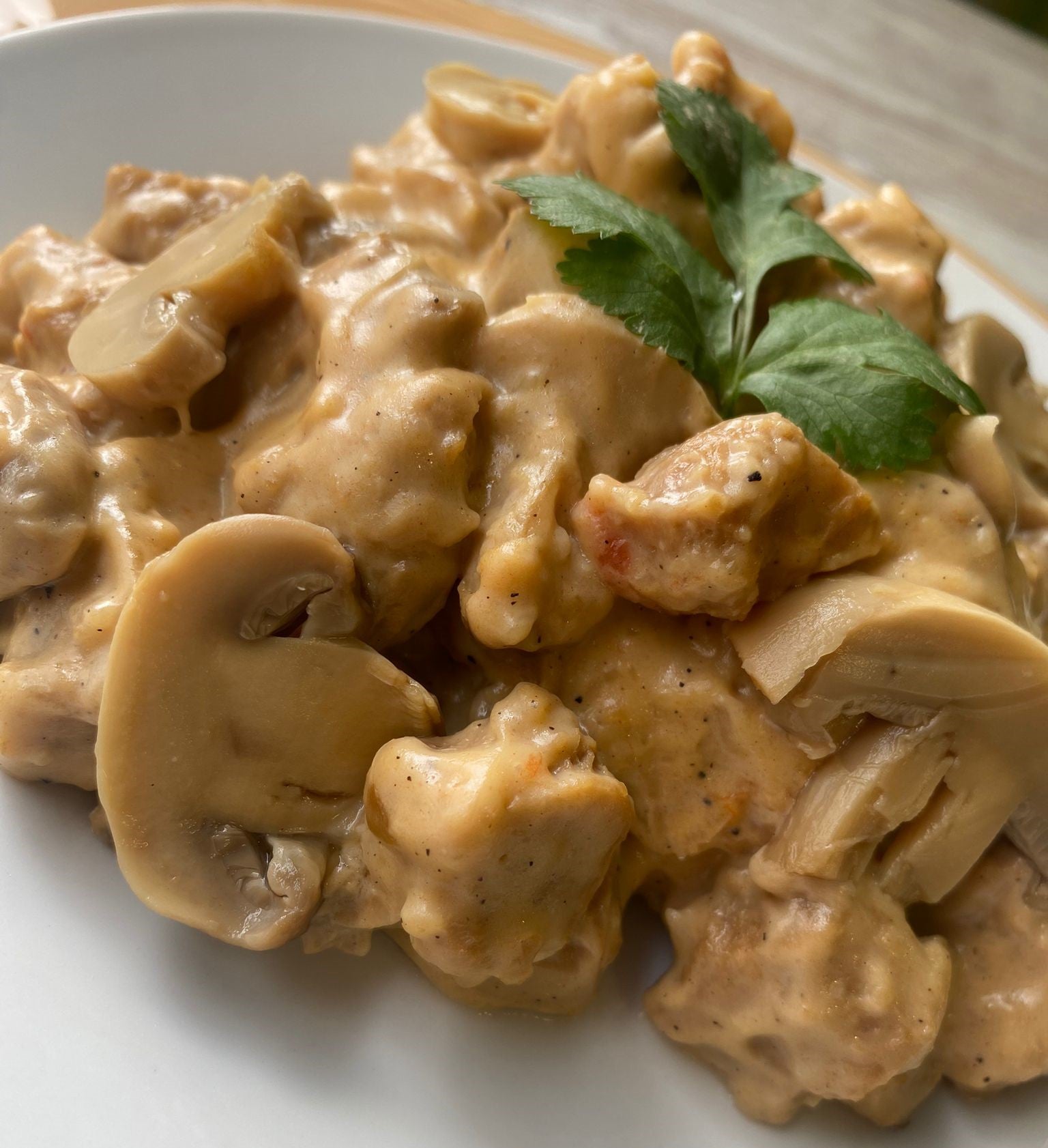 Creme culinário de soja (água, óleo de girassol, grãos de SOJA descascados (4%), açúcar, emulsionante (ésteres de sacarose de ácidos gordos), estabilizadores (goma xantana, goma de guar, carragenina), sal marinho, aroma), cogumelos (20%), água, espargos brancos (10%), soja grossa (8%) (SOJA), cebola, alho, tomate pelado (tomate, sal, acidificante (E300), agente de endurecimento (E509)), leite meio gordo, sem lactose (LEITE), molho de soja (água, SOJA, TRIGO, sal, vinagre de álcool, açúcar, aroma natural), azeite virgem, mostarda (água, vinagre de álcool, farinha de TRIGO, xarope de glicose-frutose, sal, açúcar, farinha de MOSTARDA, especiarias), molho inglês (água, vinagre de álcool, sal, açúcar amarelo, molho de SOJA (água, SOJA, TRIGO, sal), melaço, corante (E150d), extrato de MALTE e de tamarindo, especiarias), sal marinho.