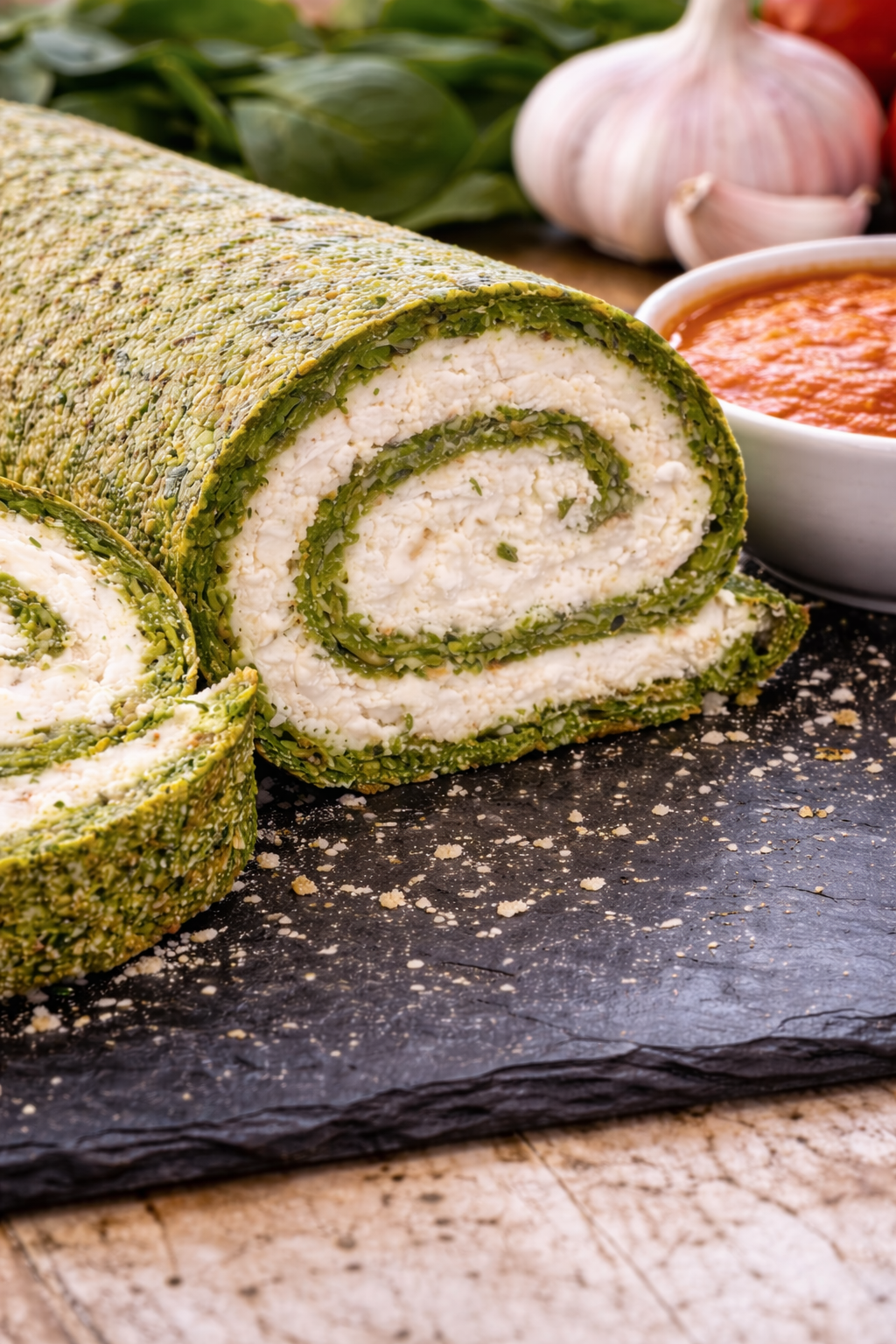 UMA TORTA COM ESPINAFRES, RECHEADA COM UM PREPARADO DE PESCADA.